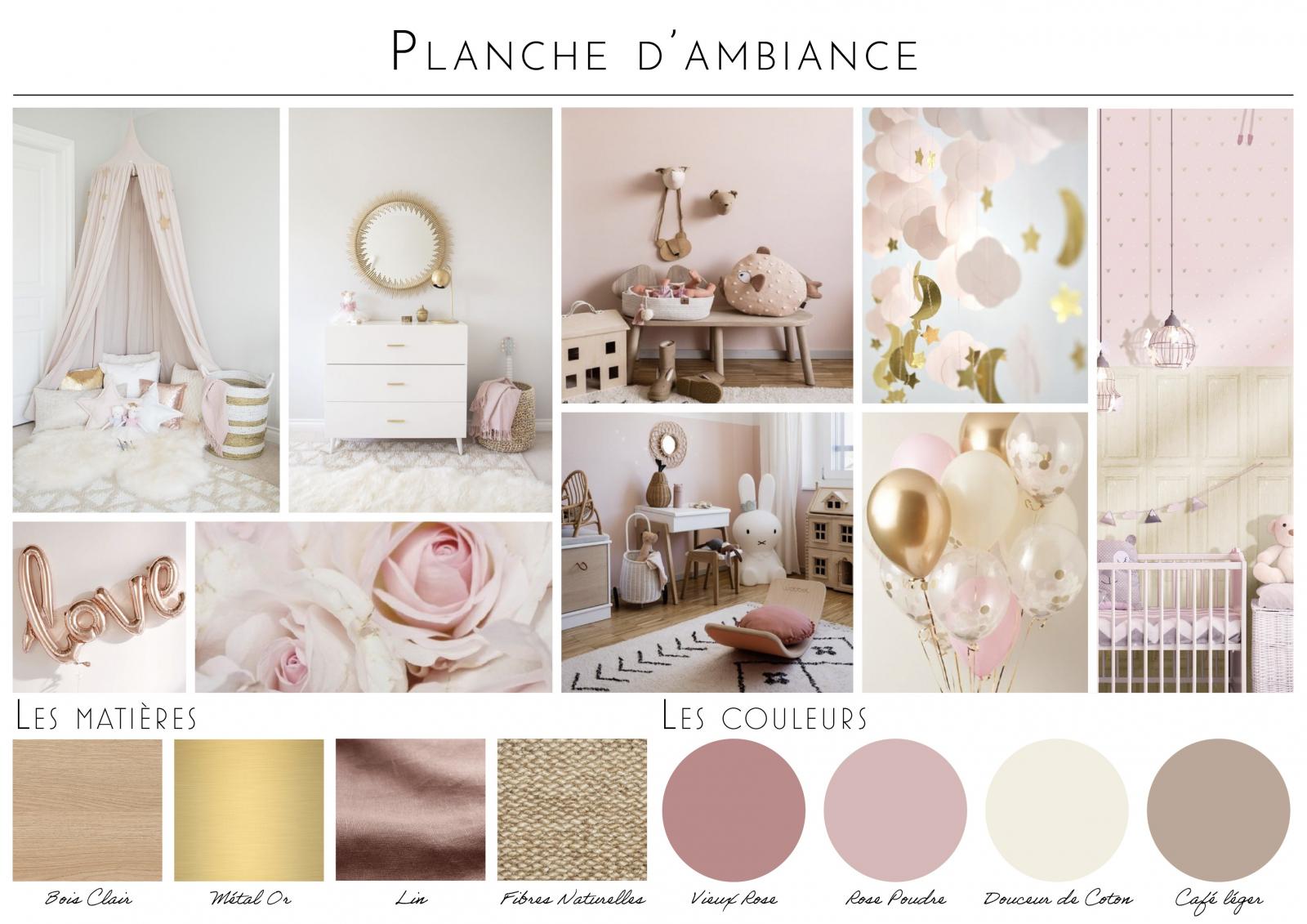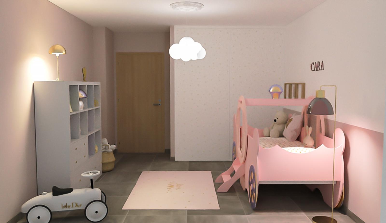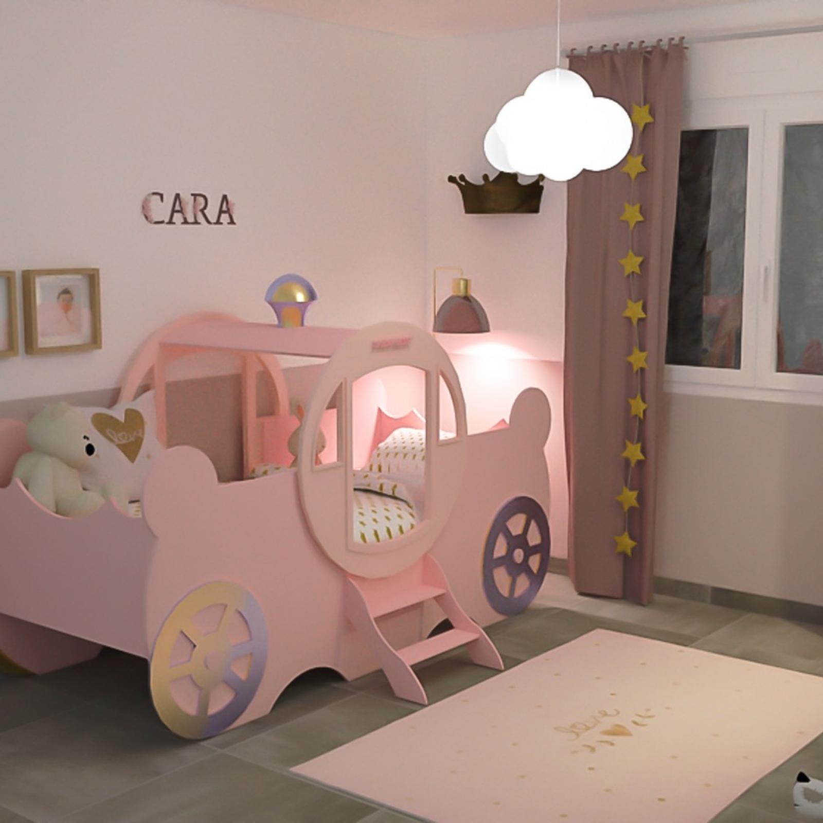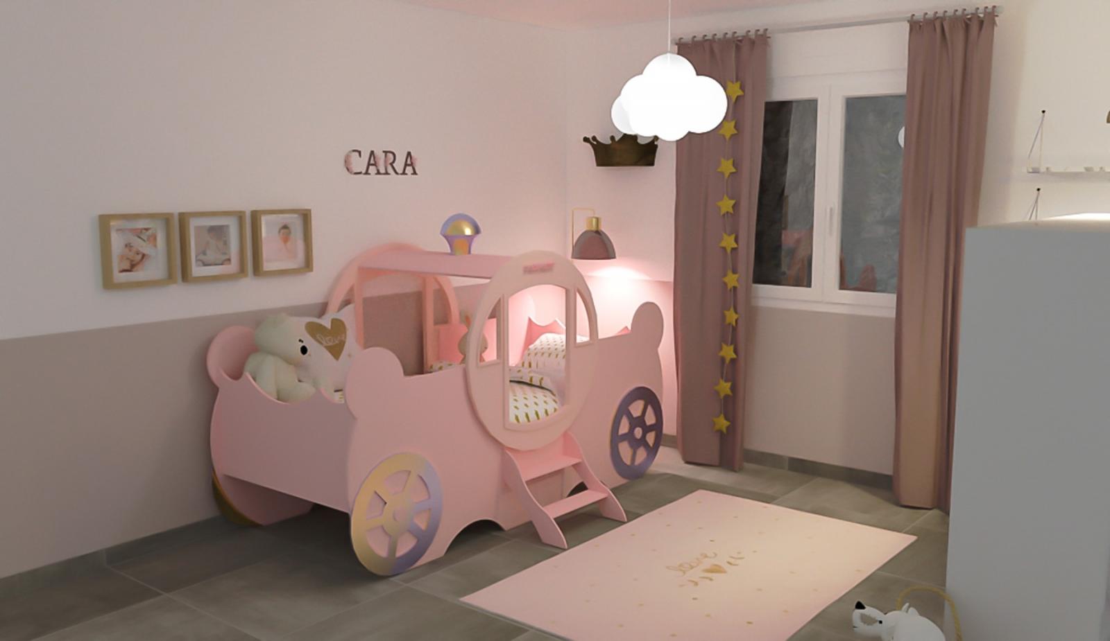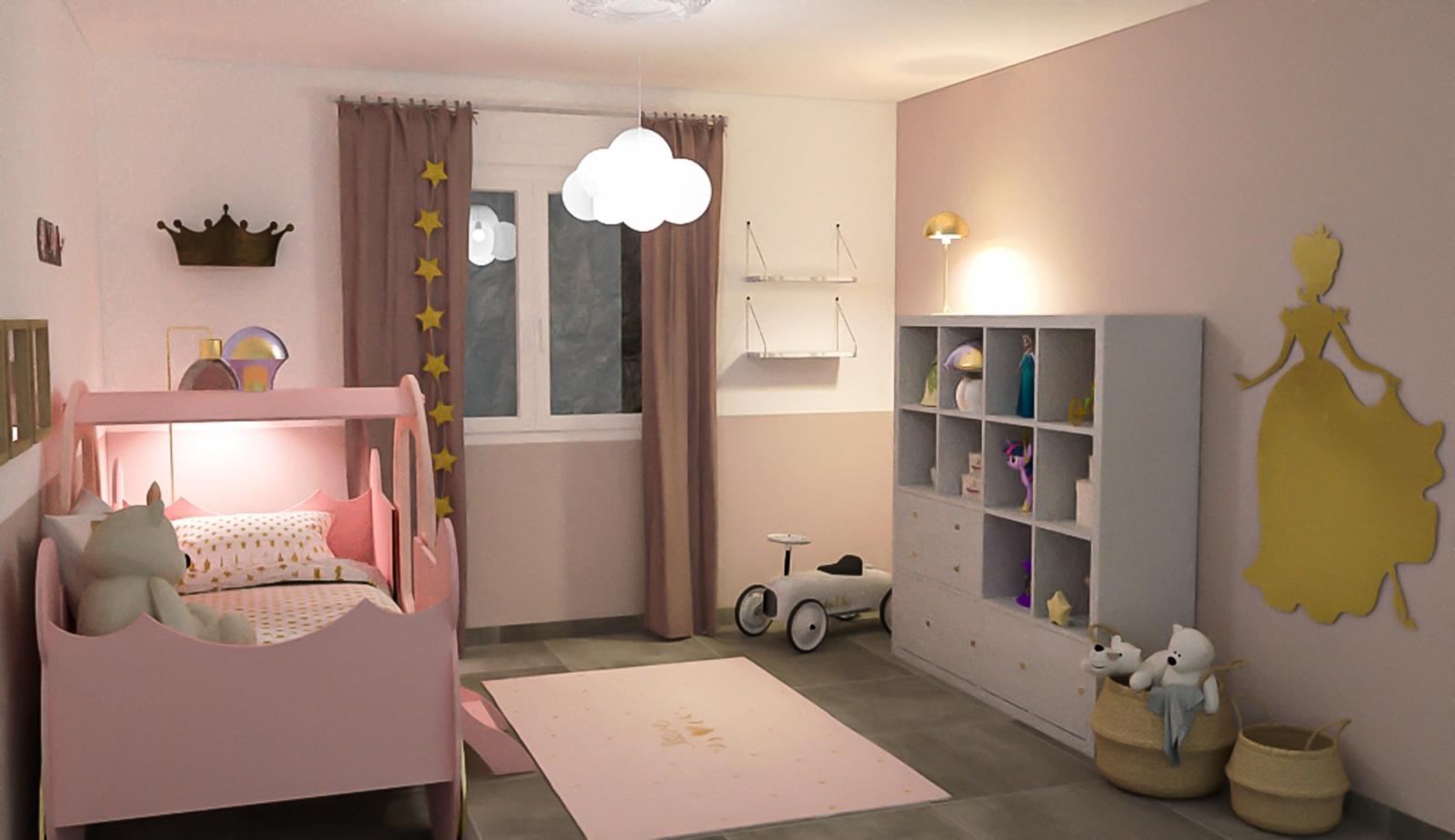Réaménagement et décoration de la chambre de Cara (2 ans). Pour que ses rêves deviennent réalité, un lit carrosse trône dans son univers favori teinté de rose et de doré.