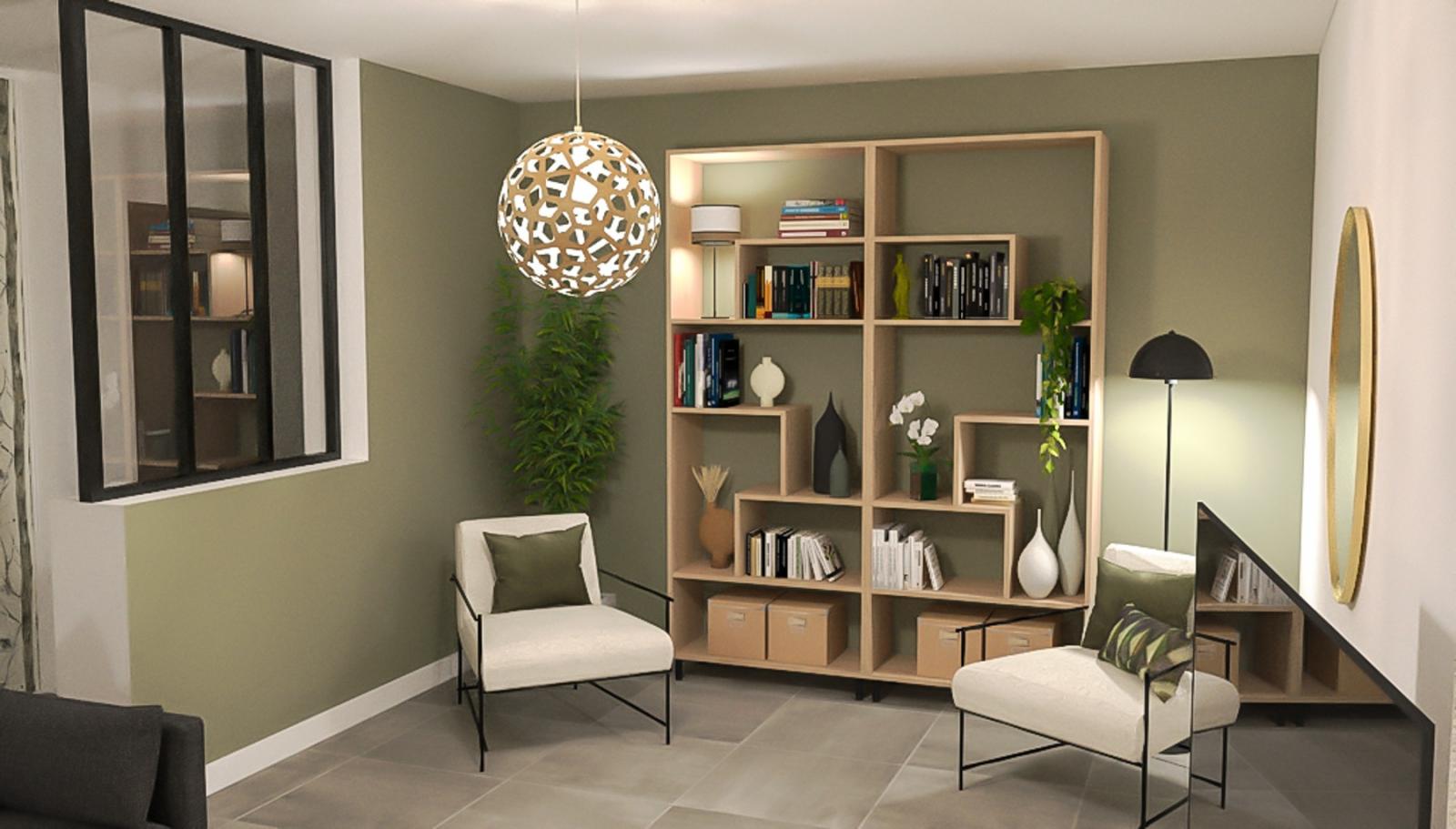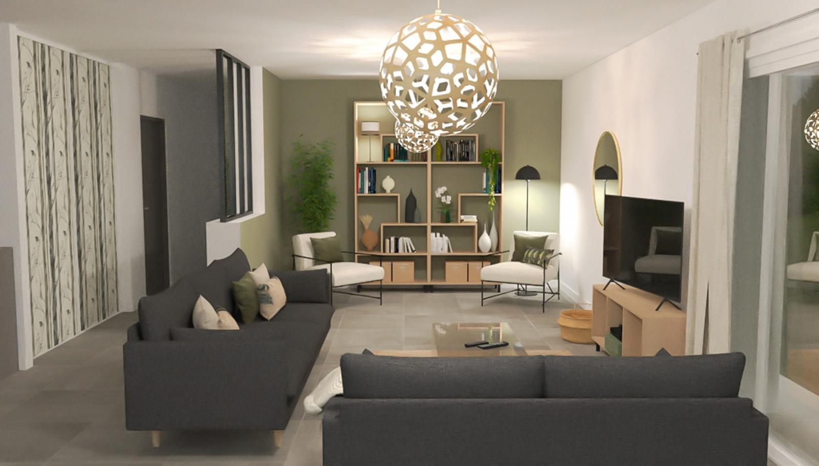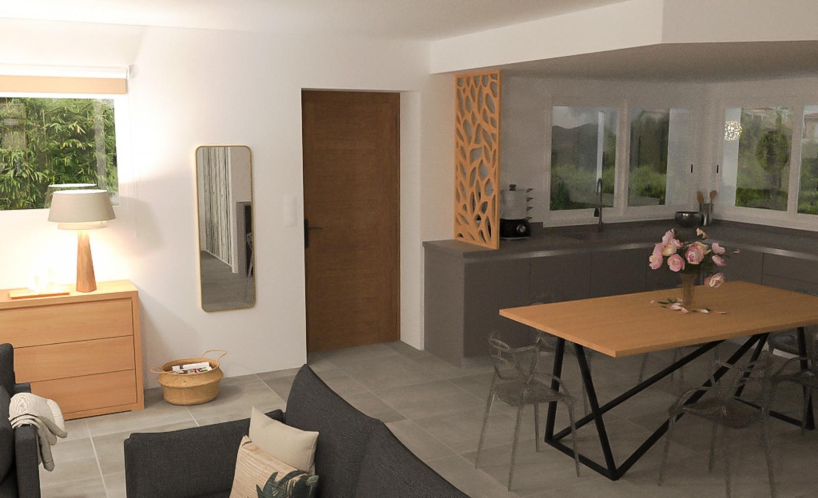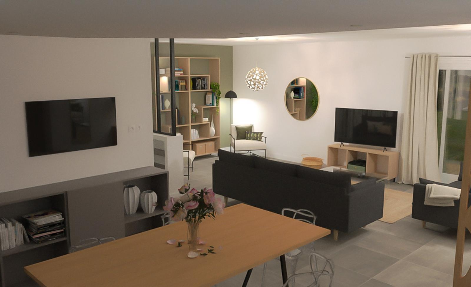 Une cloison séparant 2 pièces de petites dimensions a été supprimée pour donner place à un grand espace de vie. Une verrière a été conseillée entre le nouvel espace détente et le couloir pour optimiser la diffusion de la lumière. Le parti-pris décoratif est contemporain et laisse entrer les couleurs de l’extérieur à l’intérieur pour un mode vie « dedans/dehors ».
