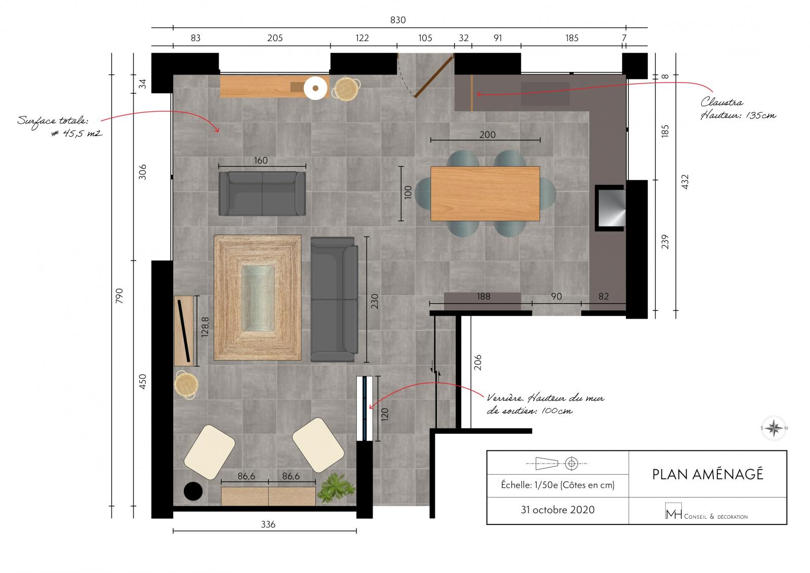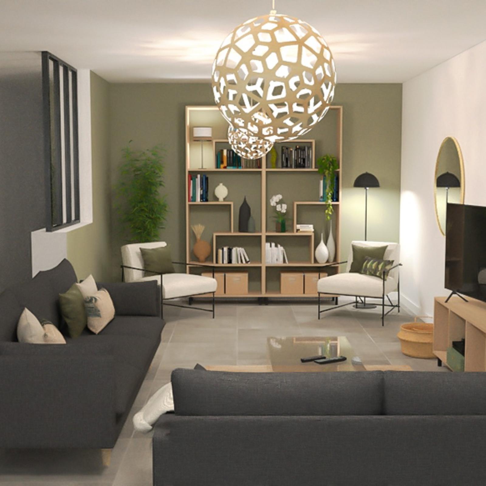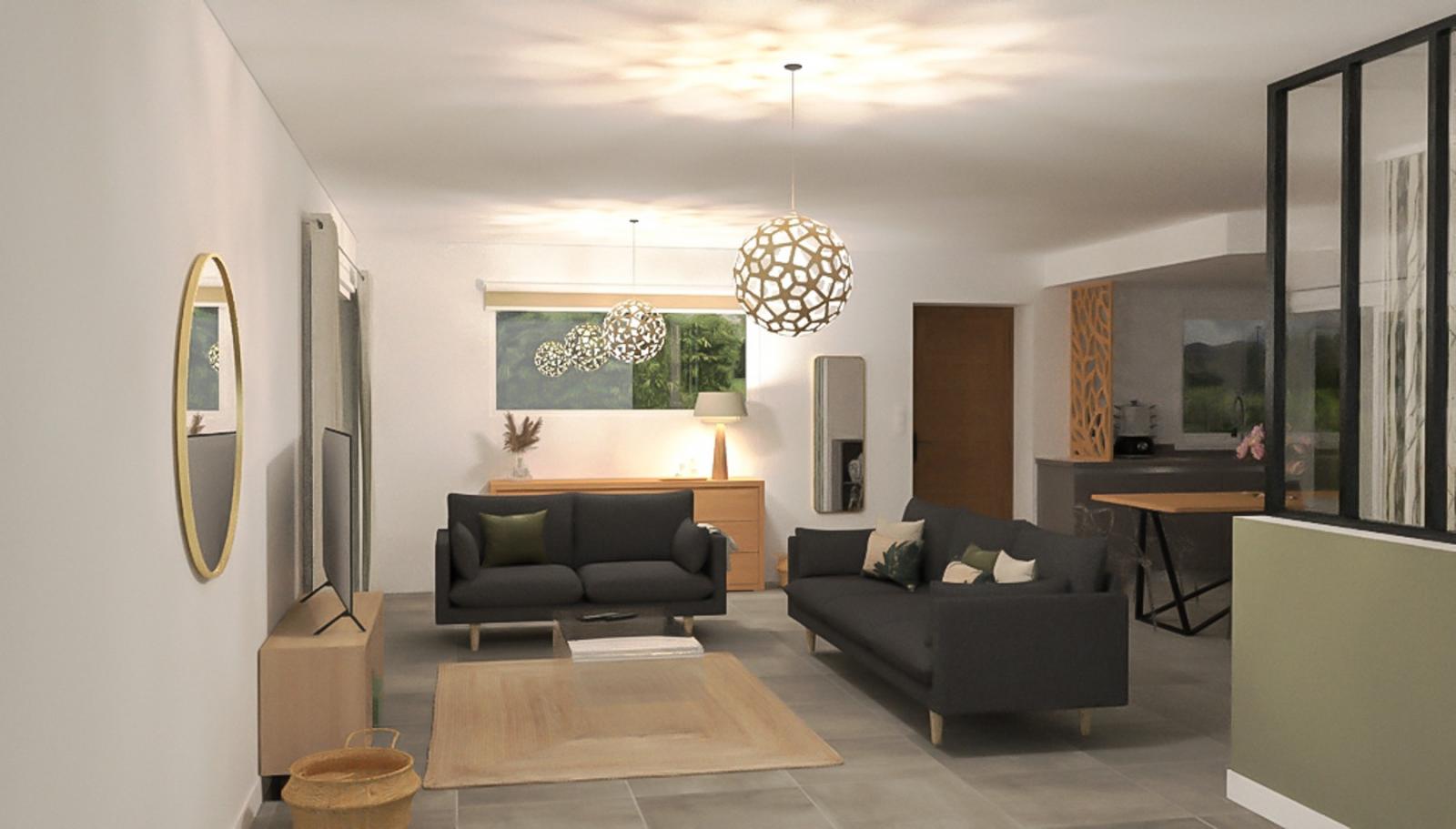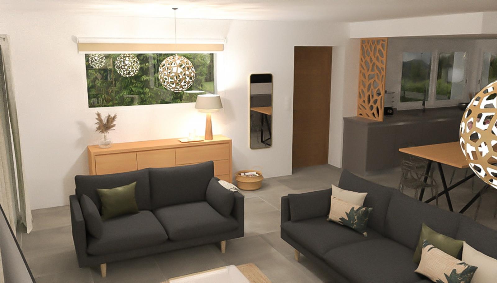Une cloison séparant 2 pièces de petites dimensions a été supprimée pour donner place à un grand espace de vie. Une verrière a été conseillée entre le nouvel espace détente et le couloir pour optimiser la diffusion de la lumière. Le parti-pris décoratif est contemporain et laisse entrer les couleurs de l’extérieur à l’intérieur pour un mode vie « dedans/dehors ».
