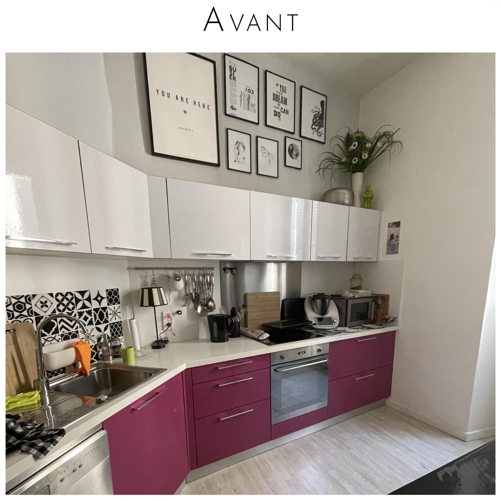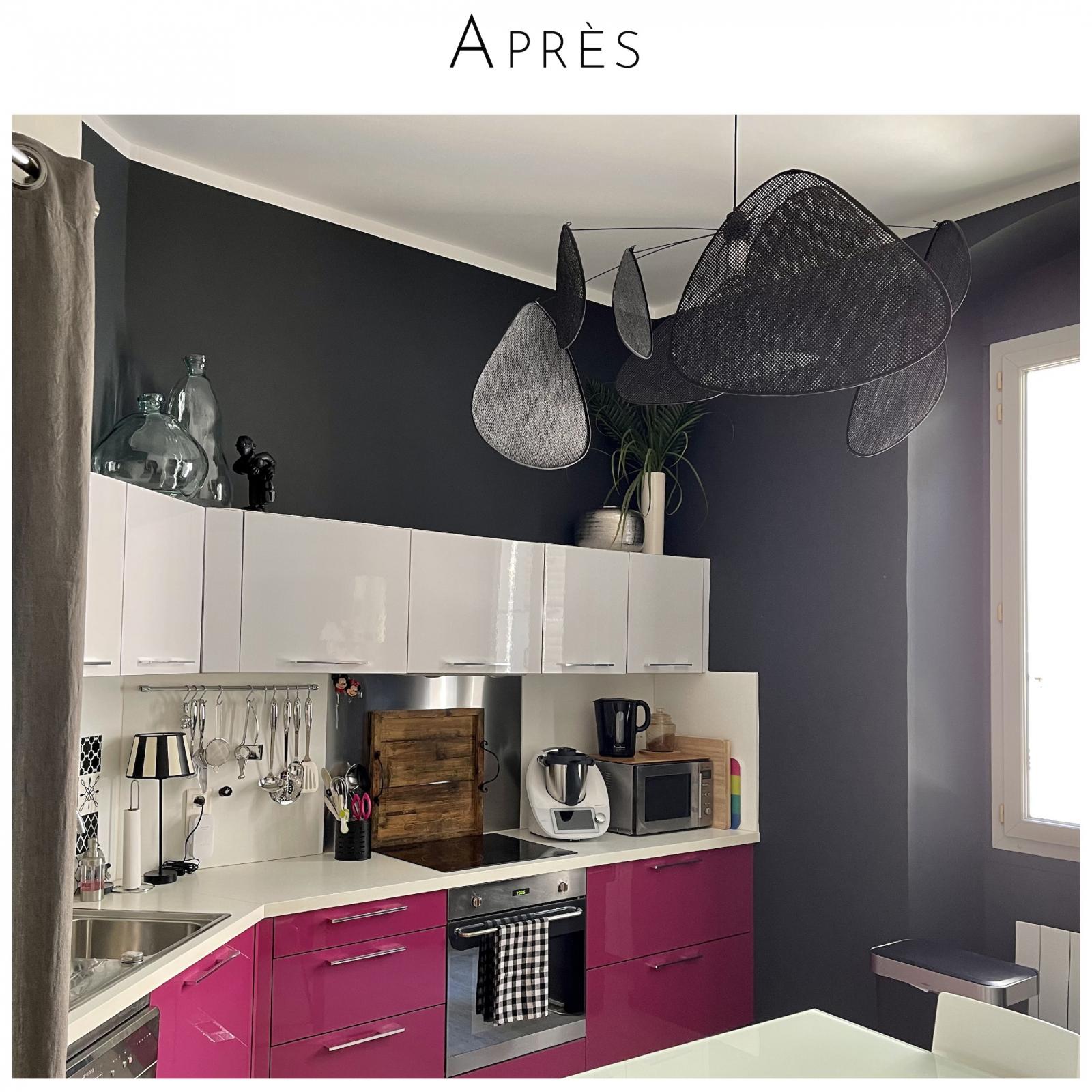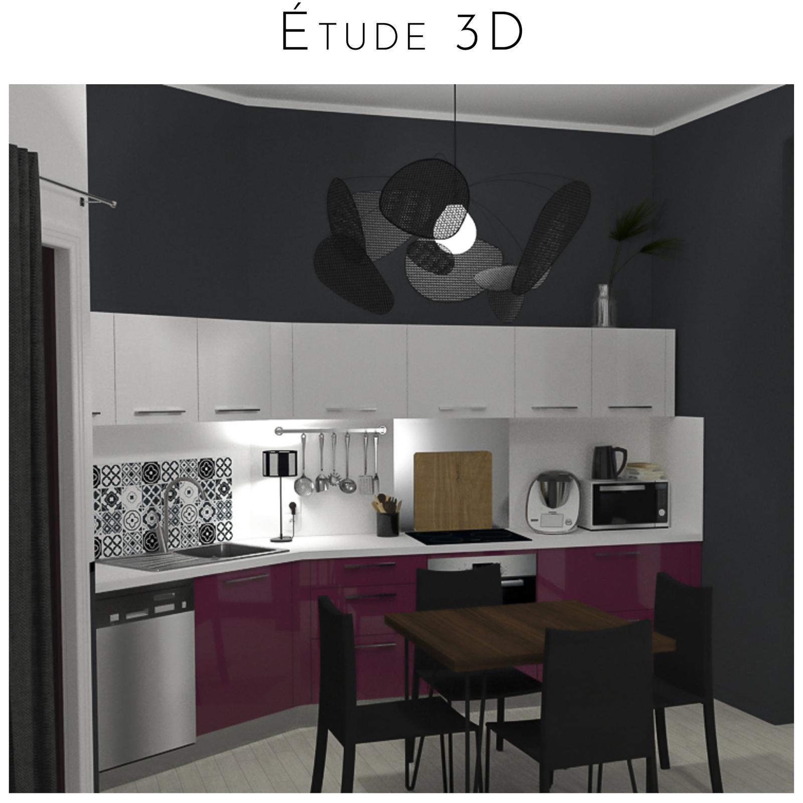 Mettre du noir sur les murs mérite un temps de réflexion! Une 3D de la cuisine a été réalisée et, grâce aux photos réalistes, le choix de la couleur a été validé. On peut comparer ici la photo 3D et le résultat après travaux, c'est bluffant!!