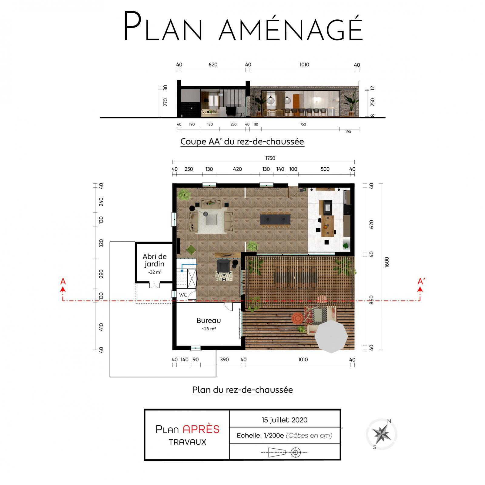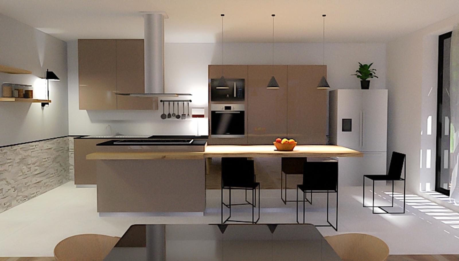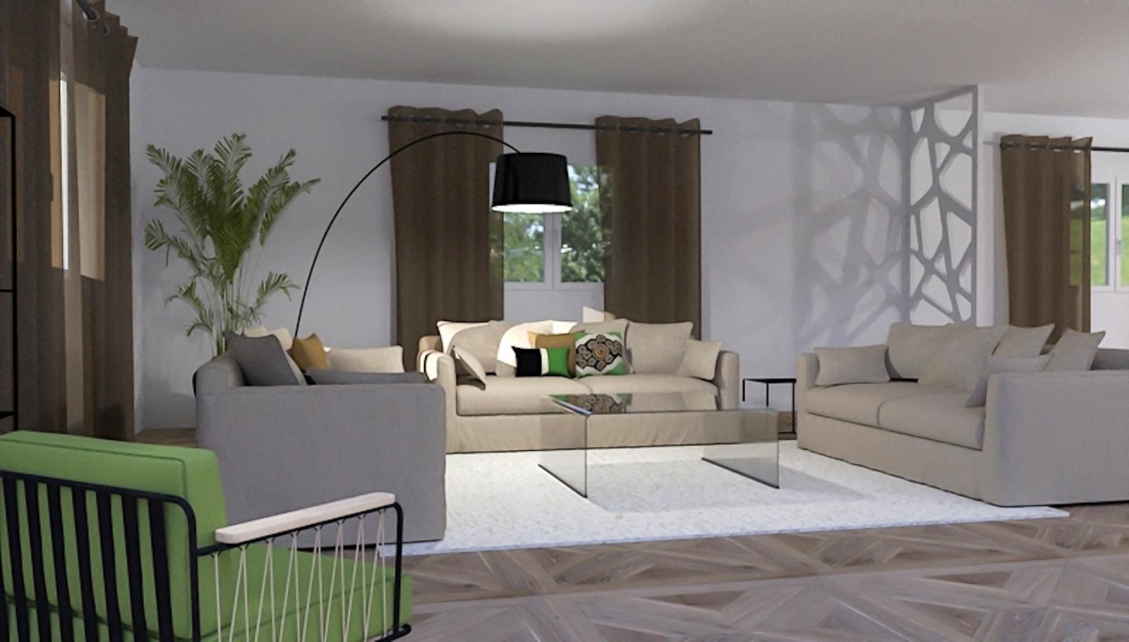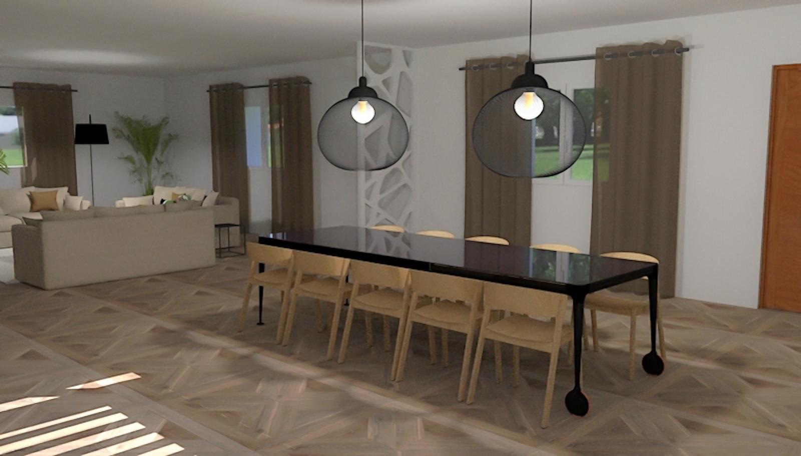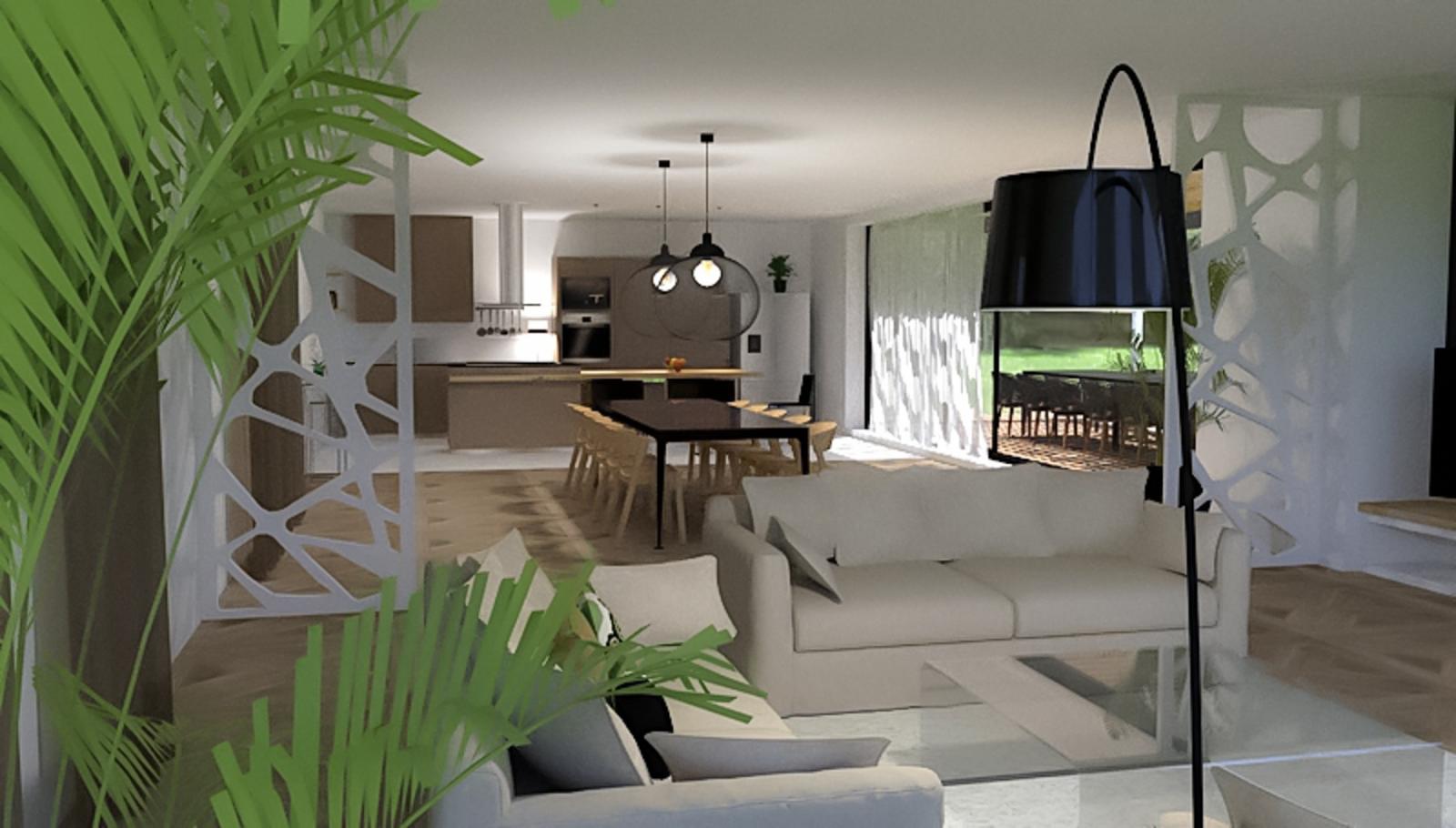 Dans ce projet, l’objectif était d’aménager un grand espace de vie constitué d’une cuisine, d’une salle à manger et d’un salon en créant une grande ouverture sur la terrasse. Le style décoratif est moderne et épuré et les couleurs s’harmonisent avec l’extérieur.