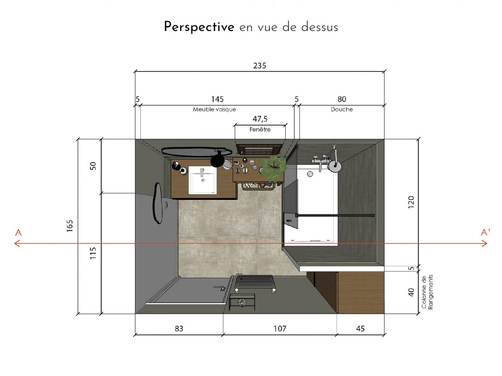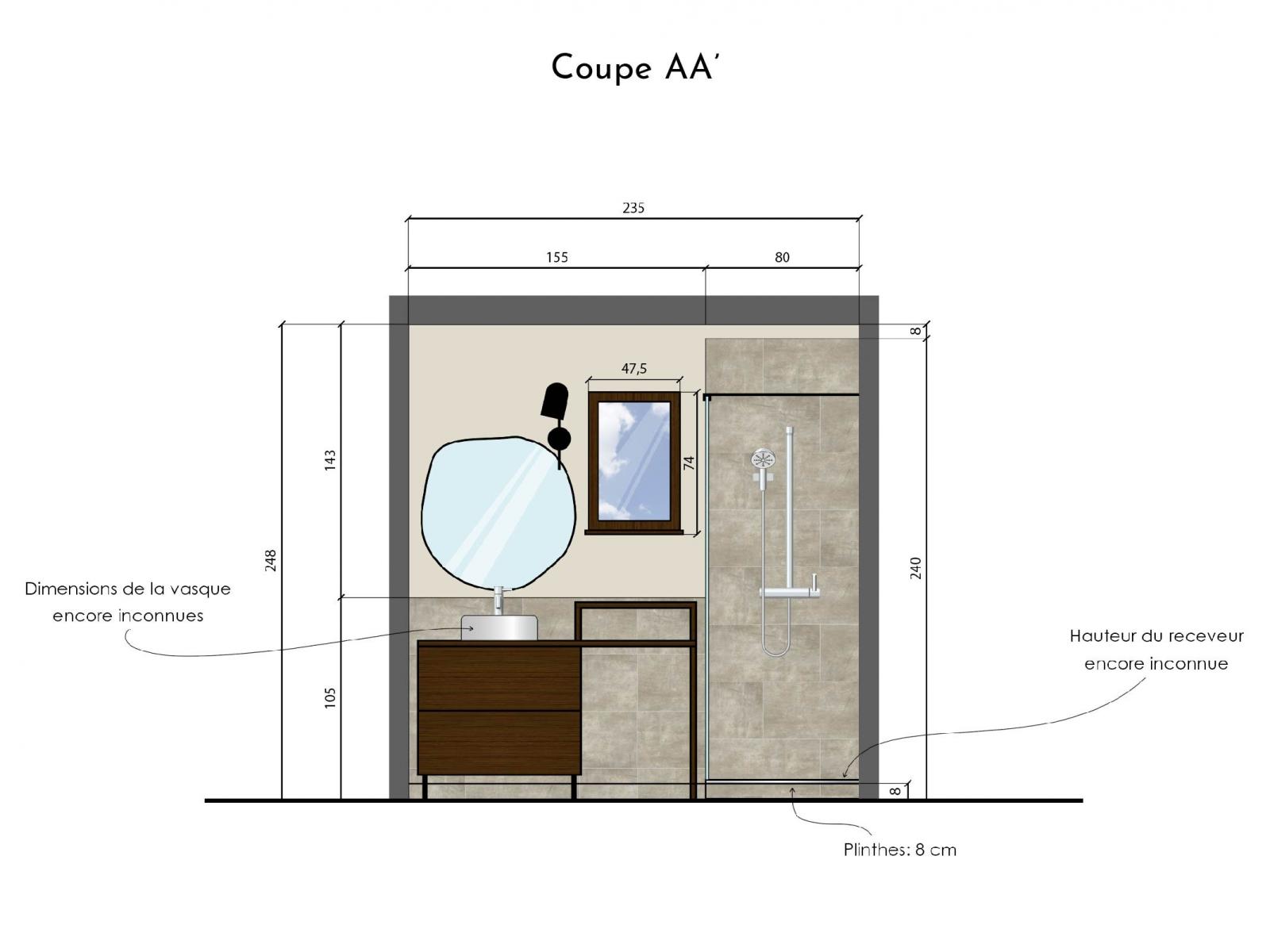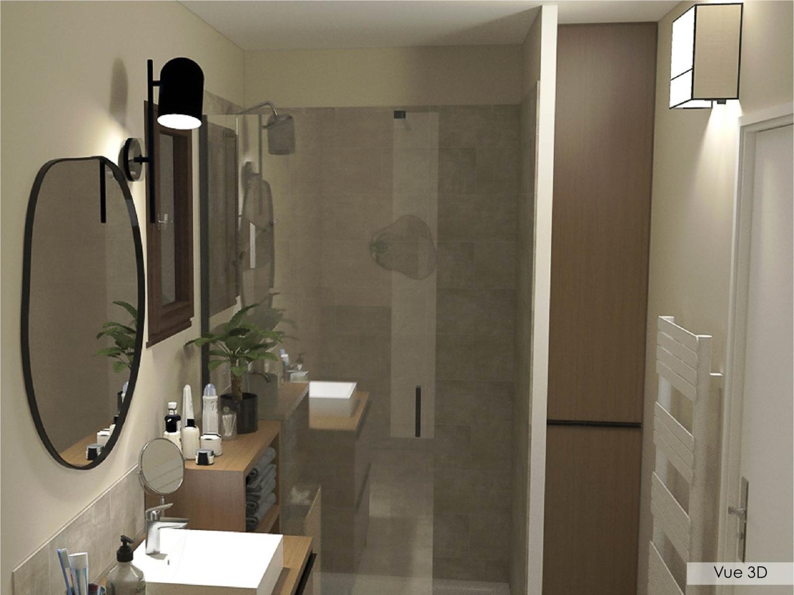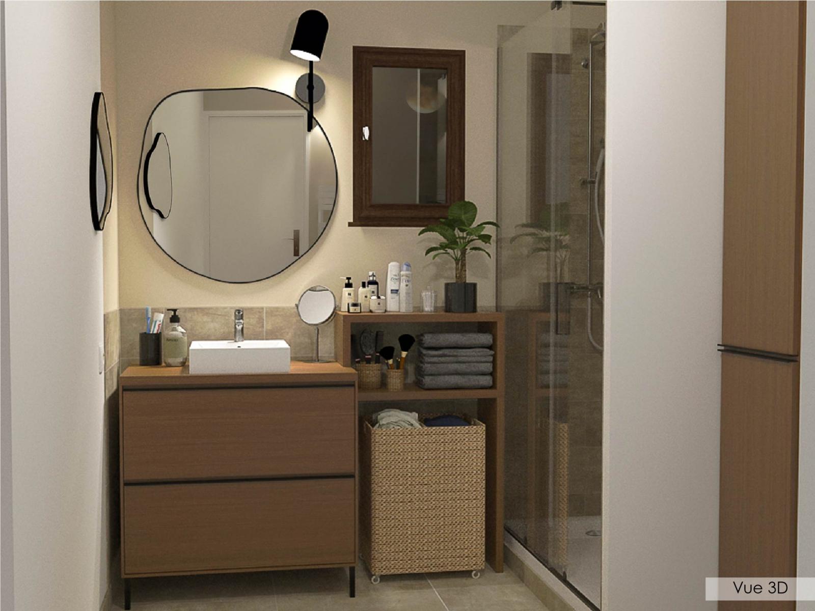 Je vous présente un projet de rénovation d'une petite salle de bain. L'objectif pour ma cliente, outre la volonté de créer une ambiance qui lui ressemble, est d'optimiser don espace de rangement. Le meuble vasque et la colonne ont donc été conçus spécifiquement et deront fabriqués sur mesure en menuiserie.
