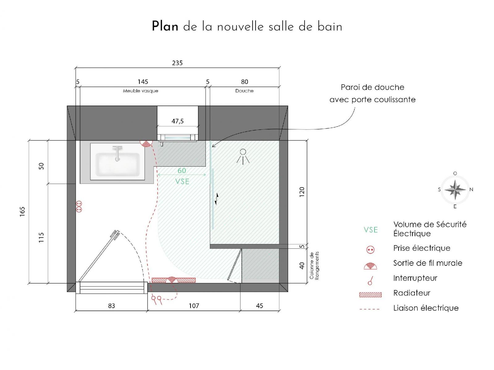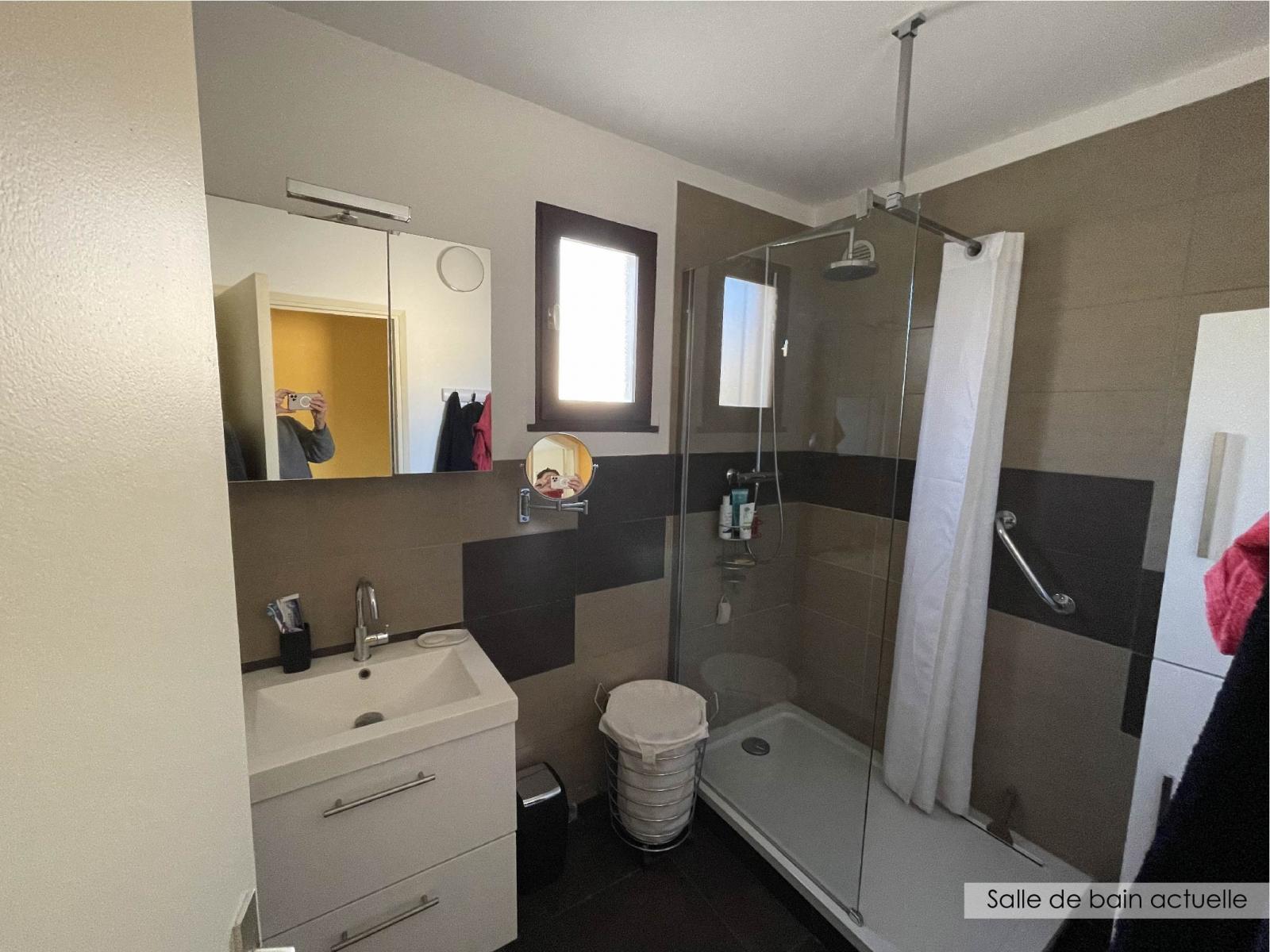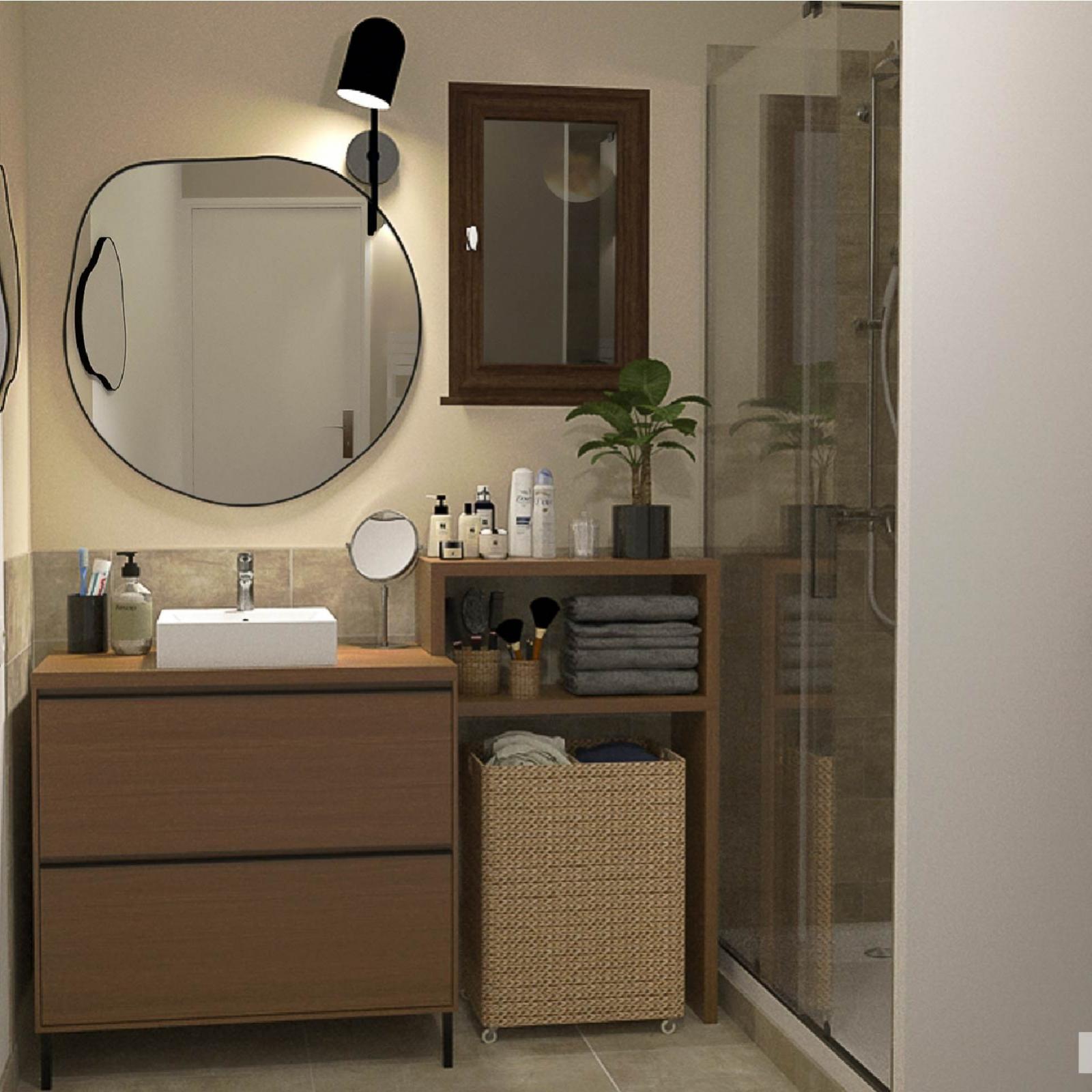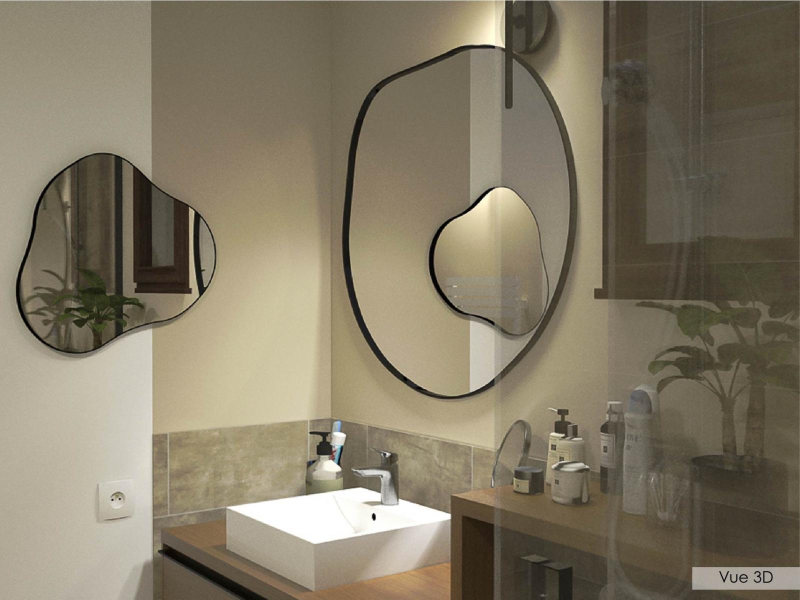 Je vous présente un projet de rénovation d'une petite salle de bain. L'objectif pour ma cliente, outre la volonté de créer une ambiance qui lui ressemble, est d'optimiser don espace de rangement. Le meuble vasque et la colonne ont donc été conçus spécifiquement et deront fabriqués sur mesure en menuiserie.
